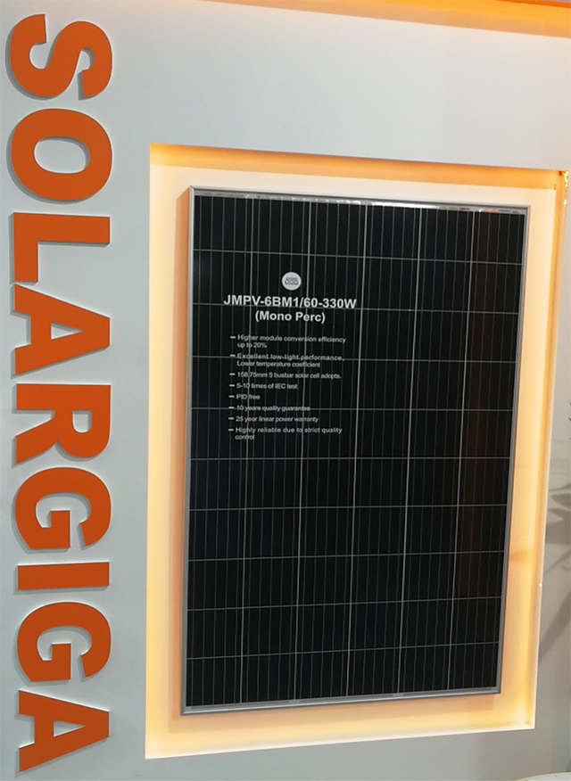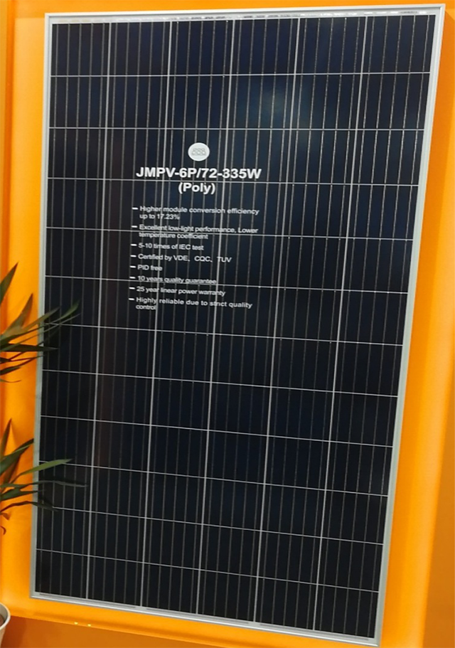 此次錦州陽光能源團隊攜最新產品亮相A1-410展臺,備受全場關注。60片方單晶組件(Mono perc)(JMPV-6BM1/60-330W),72片多晶335W組件Poly(JMPV-6P/72-335W)等高效組件吸引了眾多參展觀眾。