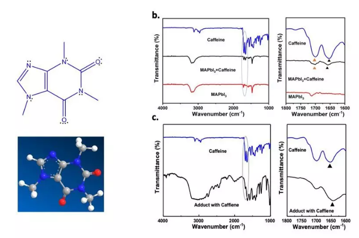 楊陽研究小組用加熱的方法將咖啡因添加到40個太陽能電池的鈣鈦礦層中,并使用紅外吸收光譜來確定咖啡因是否成功地與鈣鈦礦結(jié)合了。他們發(fā)現(xiàn)了咖啡因在與鈣鈦礦結(jié)合后,咖啡因中的羰基的特征峰發(fā)生了移動,這意味著咖啡因已經(jīng)成功與鈣鈦礦結(jié)合了。