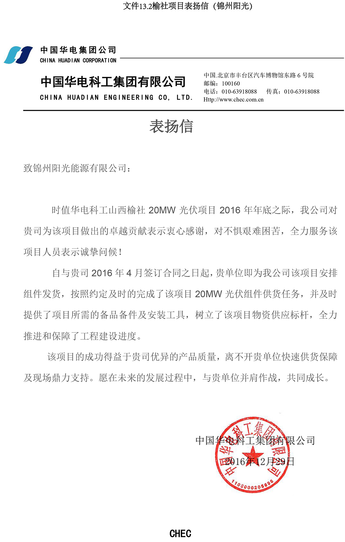 榆社項目表揚信(錦州陽光)