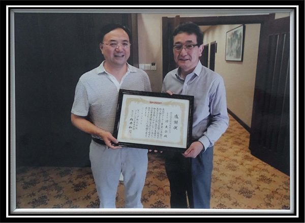 2013年9月,向井和司先生(右:夏普能源事業部本部長)為感謝陽光能源對夏普的支持和幫助,授予譚文華先生(左:錦州陽光能源董事長)感謝信。