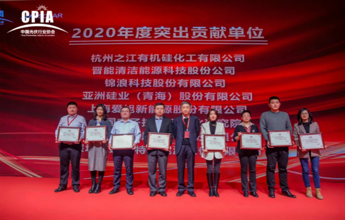 為感謝2020年度在協會各項會議活動、標準及戶用工作等方面,做出突出貢獻的會員單位,在2020年中國光伏行業年度大會期間,特授予天合光能股份有限公司、晶澳太陽能科技股份有限公司、晶科能源有限公司、陽光電源股份有限公司、浙江正泰新能源開發有限公司、隆基綠能科技股份有限公司、華為技術有限公司、錦州陽光能源有限公司、通威股份有限公司、杭州之江有機矽化工有限公司、晉能清潔能源科技股份公司、錦浪科技股份有限公司、亞洲矽業(青海)股份有限公司、上海愛旭新能源股份有限公司、蘇州賽伍應用技術股份有限公司、深圳古瑞瓦特新能源股份有限公司、中國電子技術標準化研究院17家單位“2020年度突出貢獻獎”。