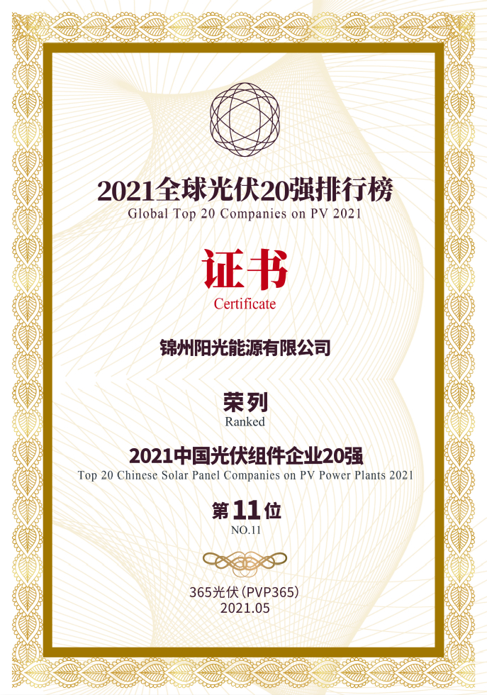 2021全球光伏20強(qiáng)排行榜榮譽(yù)證書(shū)